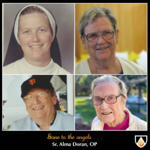 Sister Alma is predeceased by her parents, Tom and Grace Doran; her sister, Patricia Savelli (Richard); and her nephews, Richard Savelli (Judy), Steven Savelli (Ed), and Gregory Savelli. She is survived by her nieces and nephews, Susan Mialocq (Gary), Carol Savelli, Thomas Savelli (Lesley), and John Savelli (Kendal), as well as many beloved grandnieces, grandnephews, cousins, and great-grandnieces and nephews, all of whom brought her great joy. She will be deeply missed by all who knew her and especially by her Dominican Sisters.
