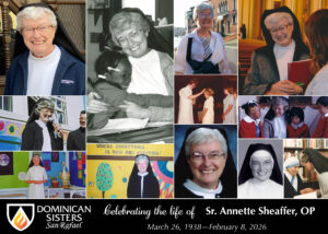 Sister Annette is predeceased by her parents, Nell and Edwin Sheaffer, her sister Janell June Anderson, and two nephews—Tim Cook and Tim Sheaffer. She is survived by her sister, Judy Cook; her brothers, Edwin K. Sheaffer III and John Mark Sheaffer; eight nieces and nephews; eleven grandnieces and nephews; nine great-grandnieces and nephews; and by her Dominican Sisters.